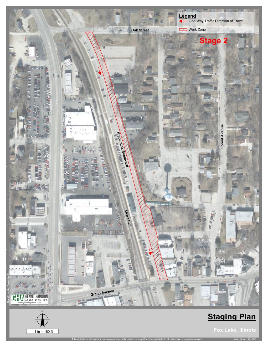 Next week, weather permitting, the contractor plans to pour additional gapped sidewalk sections along the east side of Nippersink Boulevard between Grand Avenue and Rolland Place. They also plan to continue work on the new retaining wall on the east side of Nippersink Boulevard.